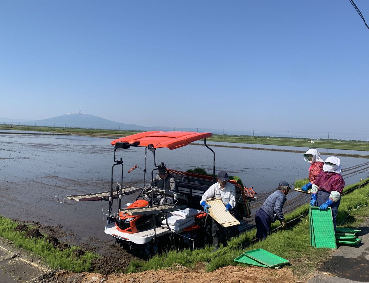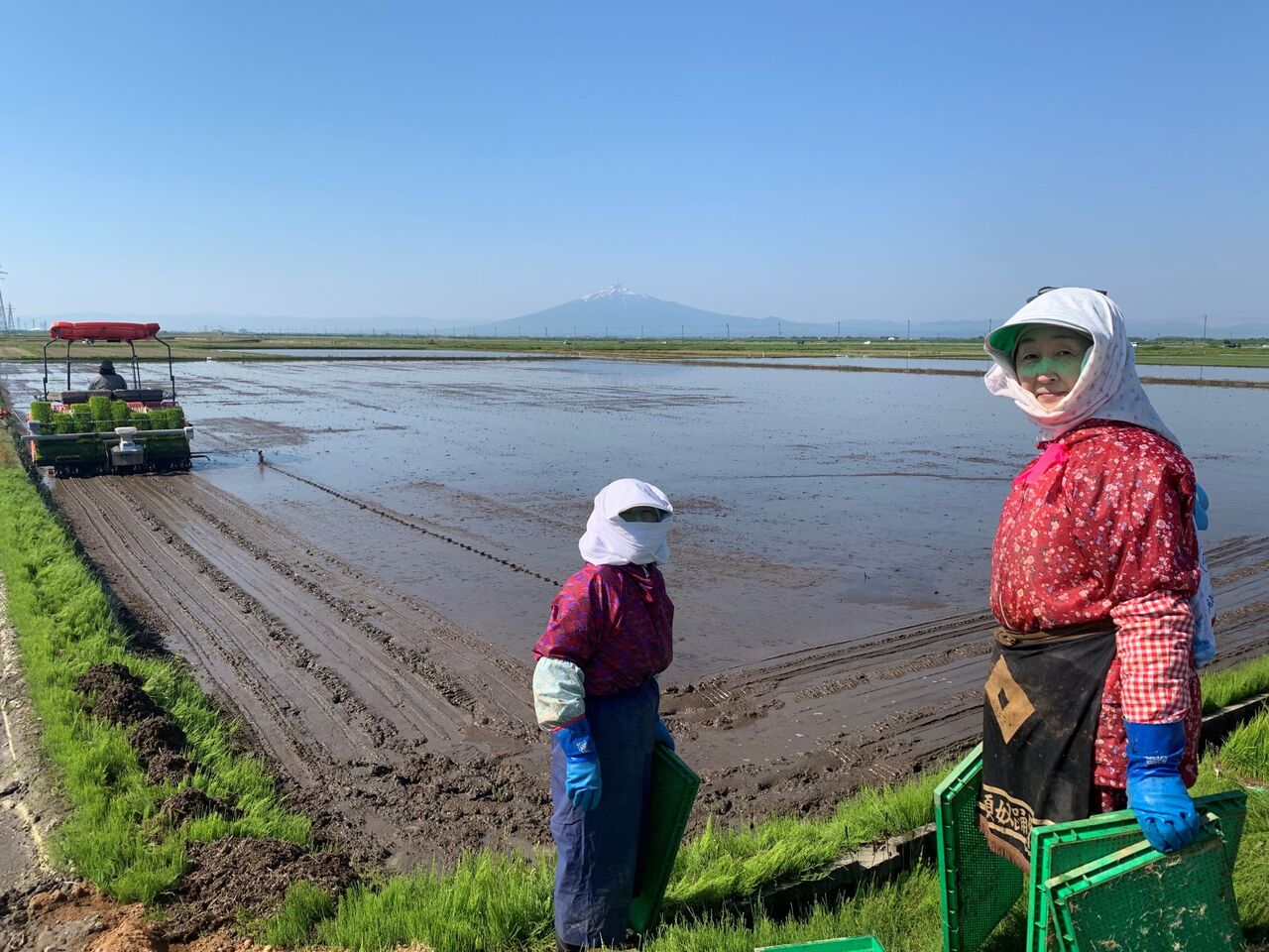 「おらほの姉っこ、粒ぞろいだね~!」と、田植え機に