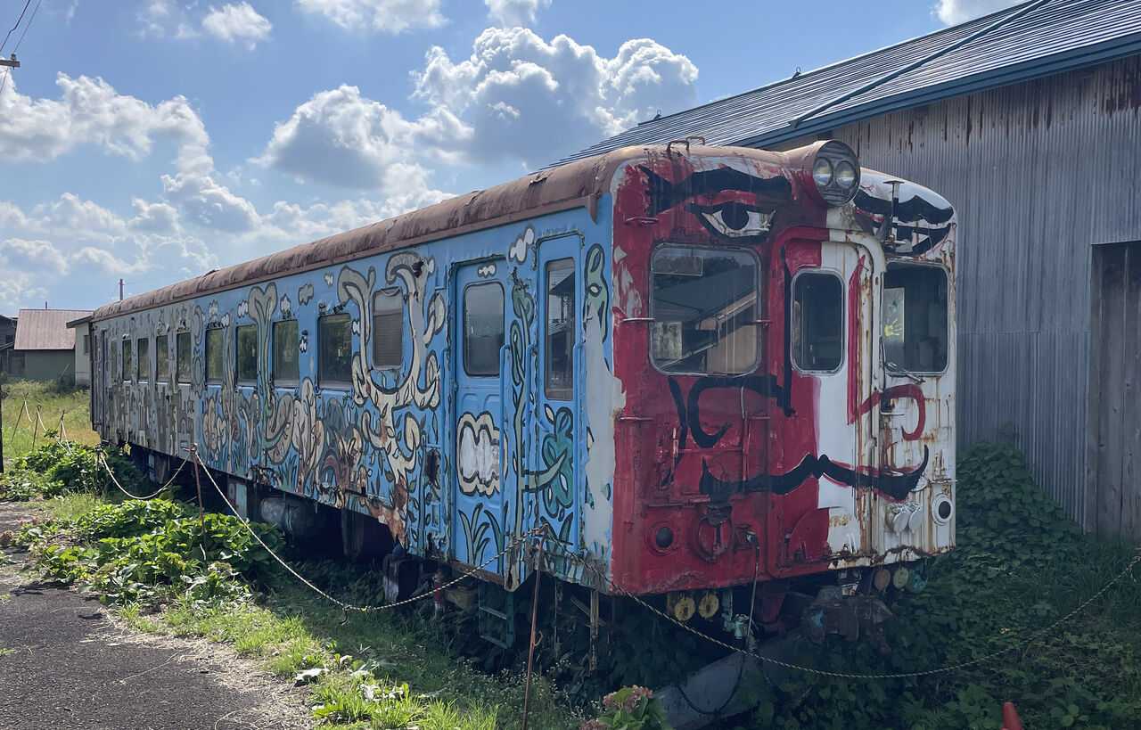 津軽鉄道、嘉瀬駅にひっそりとあるペイントされた車両。